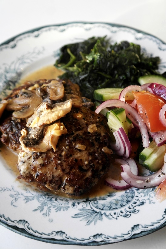 Hönsfärsbiffar med champinjonsås, smörstekt spenat samt en lök- och tomatsallad